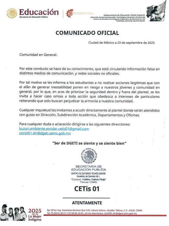 En el Centro de Estudios Tecnológicos Industrial y de Servicios N°01 "Coronel Matilde Galicia Rioja", nos comprometemos a proteger la privacidad y los datos personales de nuestros alumnos, padres de familia o tutores. De acuerdo con la Ley General de Protección de Datos Personales en Posesión de Sujetos Obligados (LGPDPPSO), por lo que ponemos a su disposición los siguientes avisos: