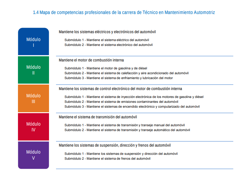 Durante el proceso de formación de los cinco módulos, el estudiante desarrollará o reforzará las siguientes competencias profesionales, correspondientes al Técnico en mantenimiento automotriz: