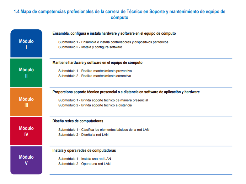 Durante el proceso de formación de los cinco módulos, el estudiante desarrollará o reforzará las siguientes competencias profesionales, correspondientes al Técnico en soporte y mantenimiento de equipo de cómputo: